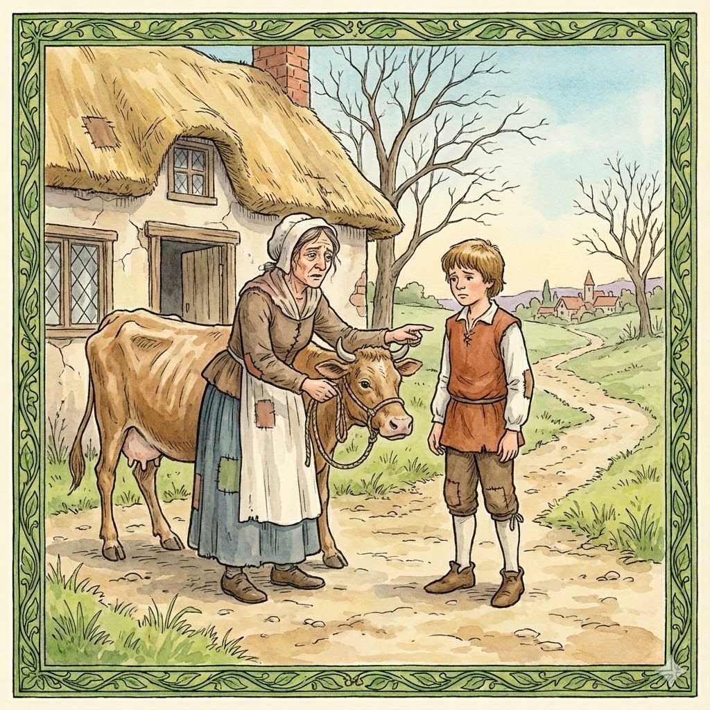 Once upon a time, there was a boy named Jack who lived with his mother. They were very poor, so his mother told him to go to the market and sell their cow.